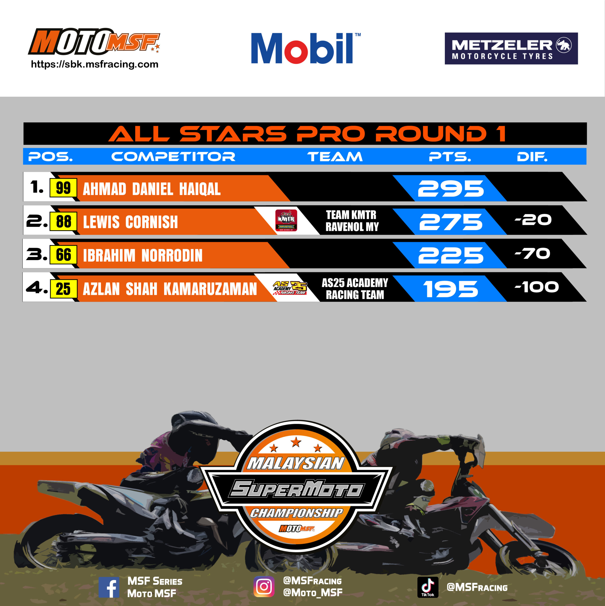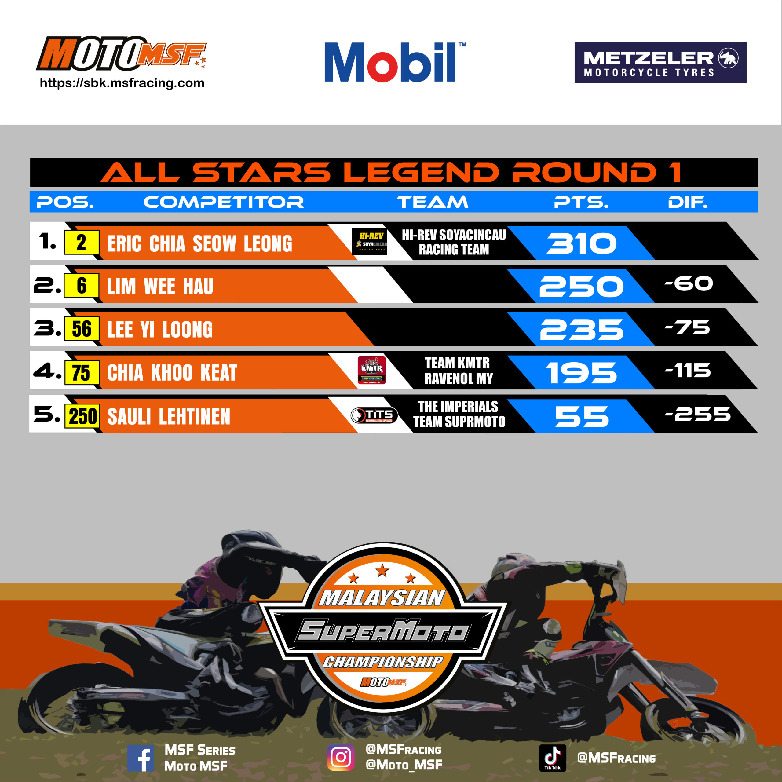 After the first round at Litar Lumba Rakyat Kuala Selangor (LLRKS), the championship points standing has already taken shape, with some riders emerging as early contenders for the title. In the Allstars Pro category, Ahmad Daniel Haiqal, Lewis Cornish, and Ibrahim Norrodin dominated the top three spots. Meanwhile, in the Legend category, Eric Chia emerged as the early leader, with a commanding performance that earned him the top spot on the podium.