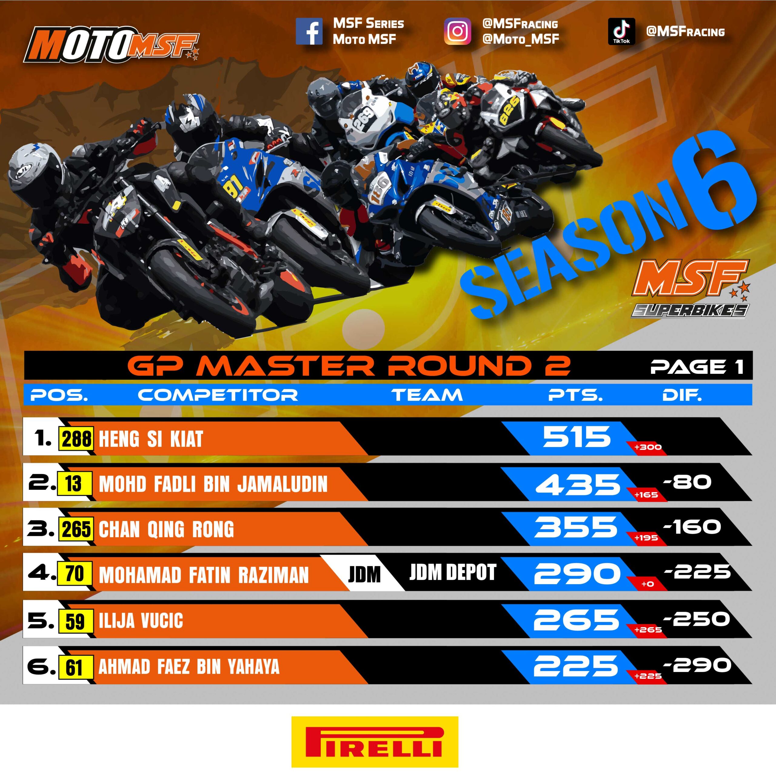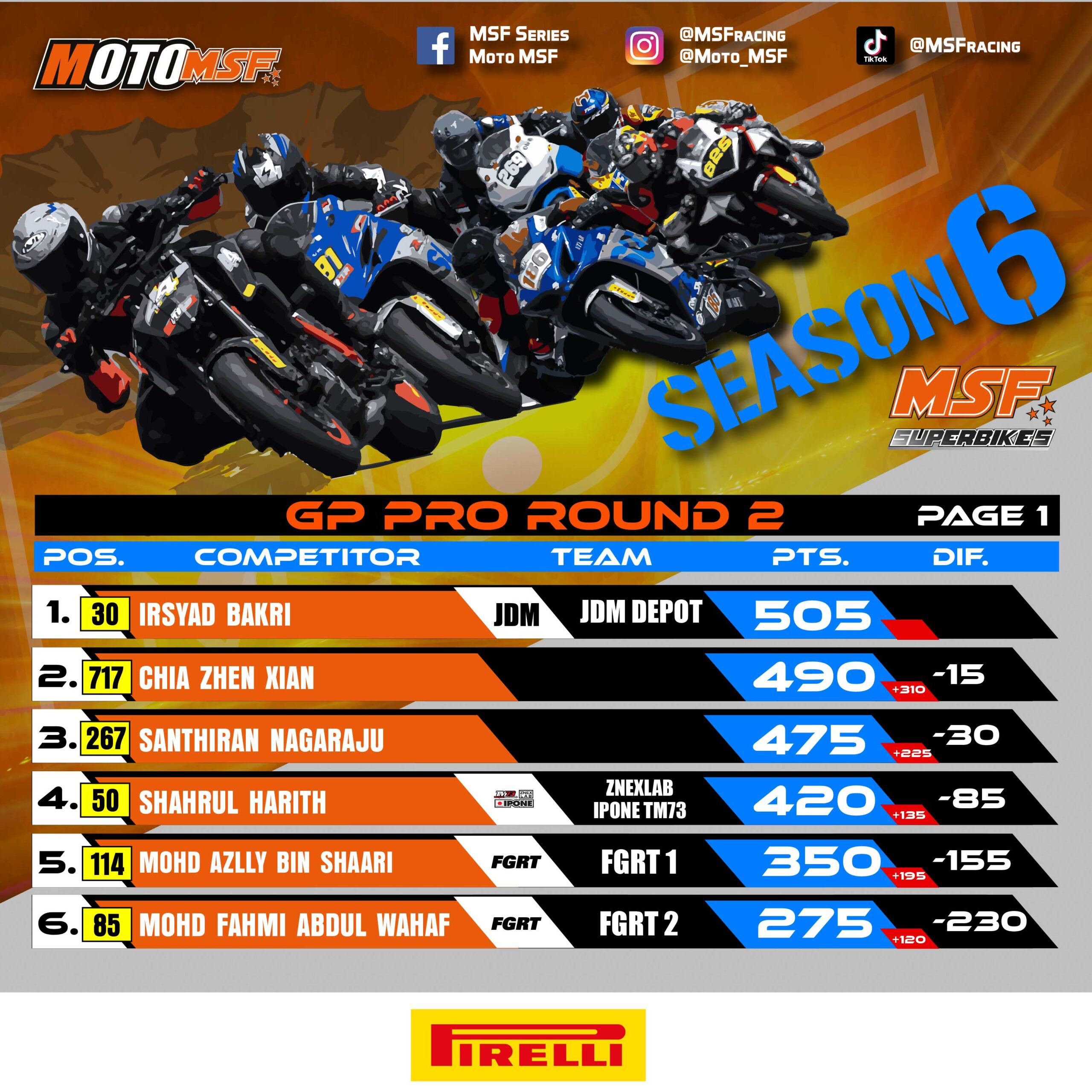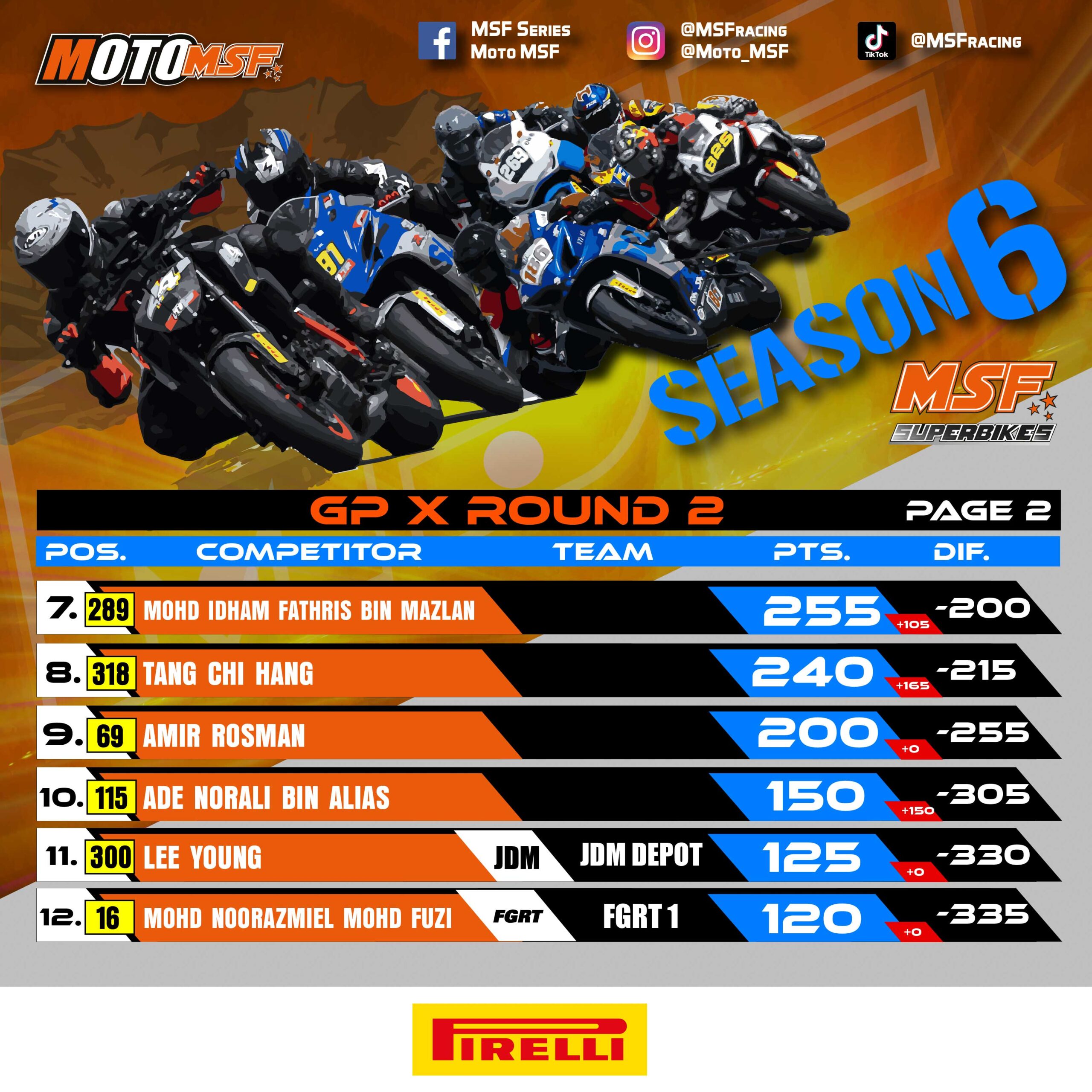 The GP Pro category remains highly competitive, with Irsyad Bakri from JDM Depot leading at 505 points, while GP X has Muhd Amirul Saleh from FGRT 2 at the top with 455 points. The SuperSport class saw Zhafir Zarkasha Zamani extending his lead with an impressive 620 points, while the Super Rookie category remains tight, with Muhd Iskandar Zulkarnain leading with 400 points.