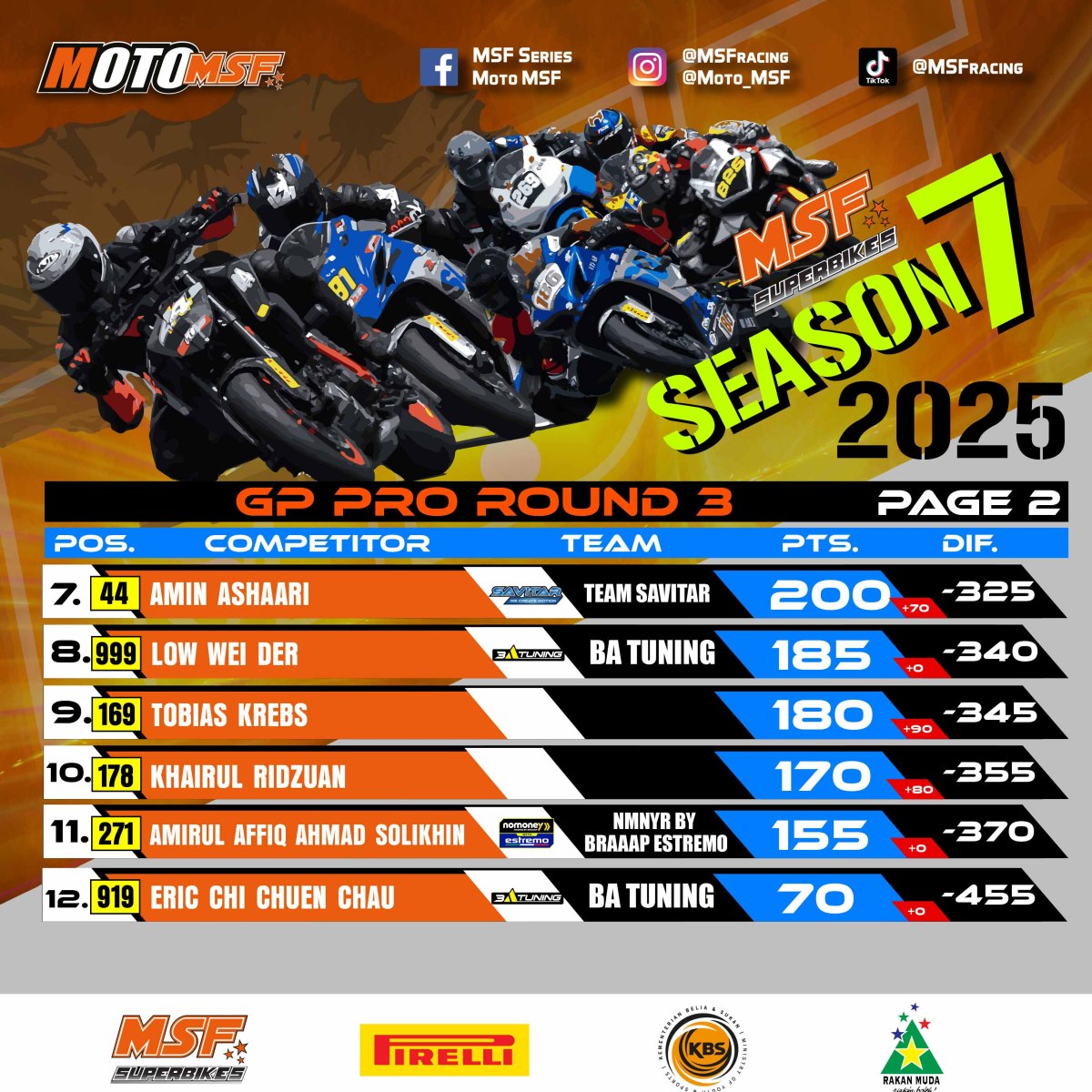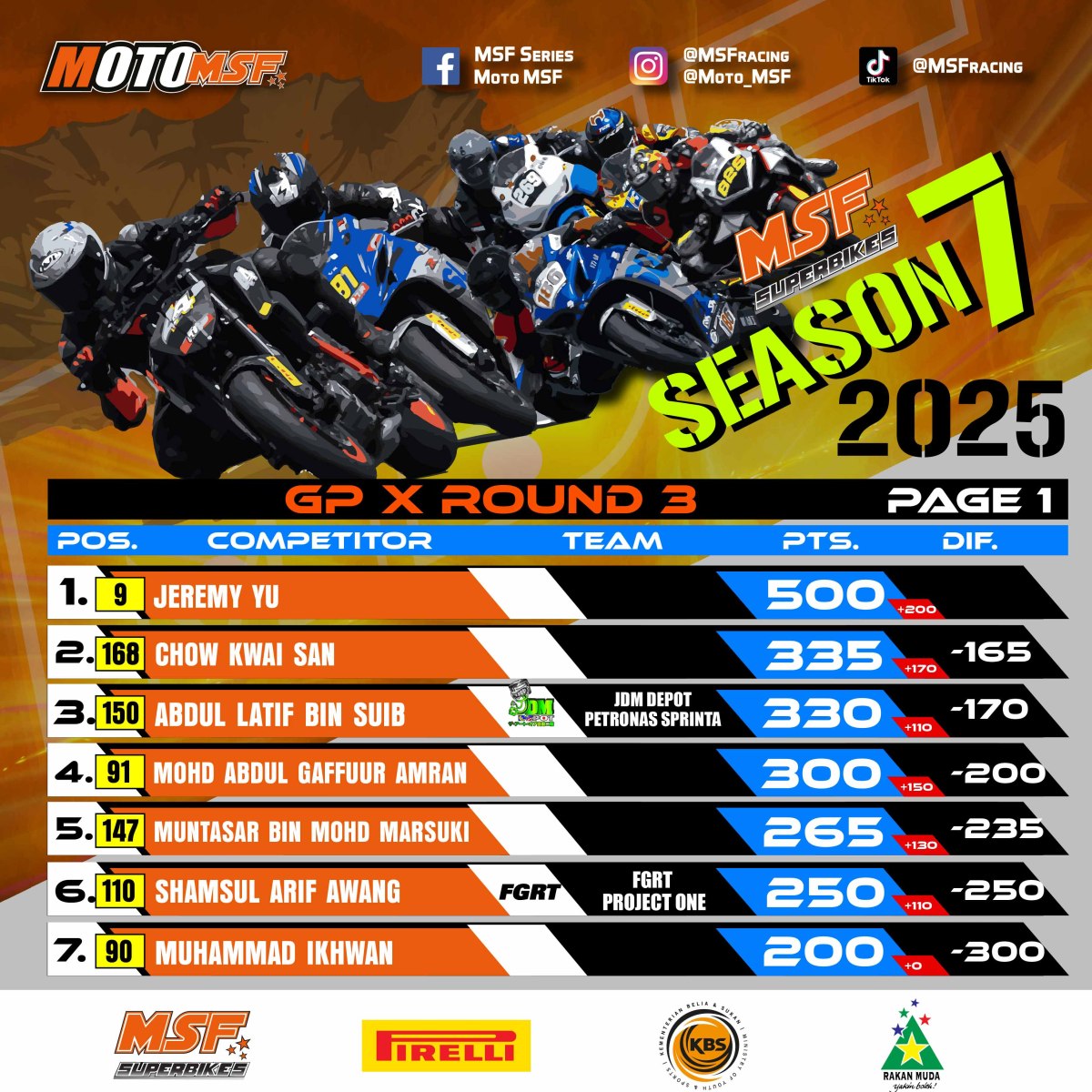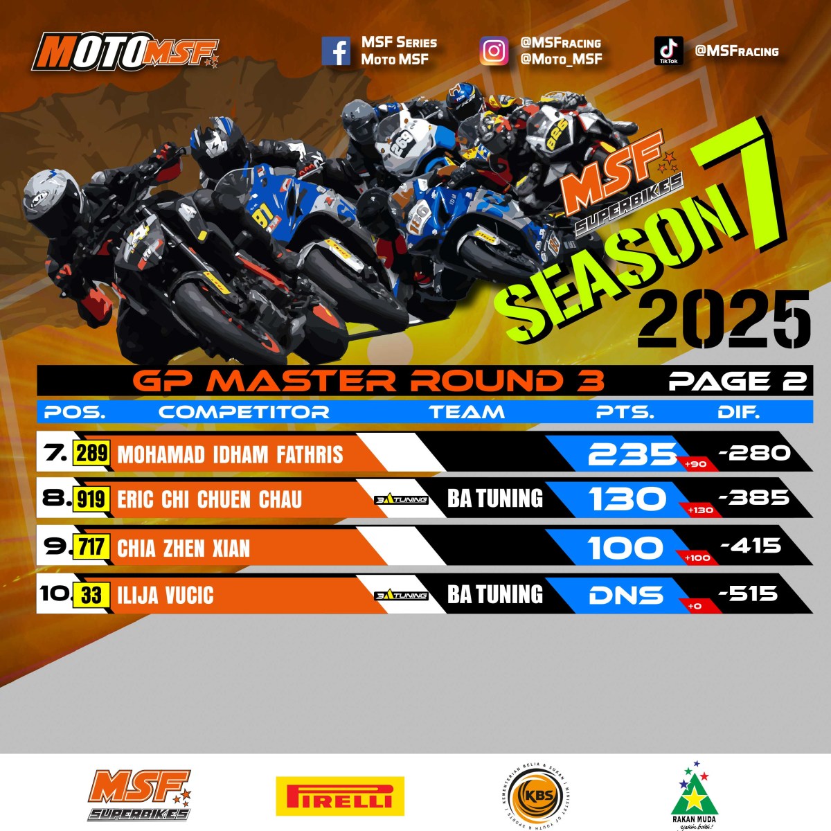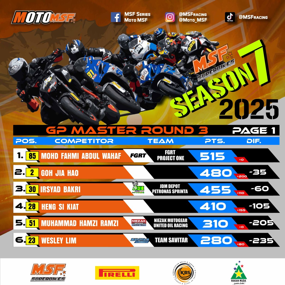 In GP Master, Mohd Fahmi Abdul Wahaf (FGRT Project One) still leads with 515 points, but Goh Jia Hao’s win in Round 3 has him closing in fast at 480 points. Irsyad Bakri (JDM Depot Petronas Sprinta) follows at 455 points, making this class one of the most unpredictable battles heading into the later rounds.
