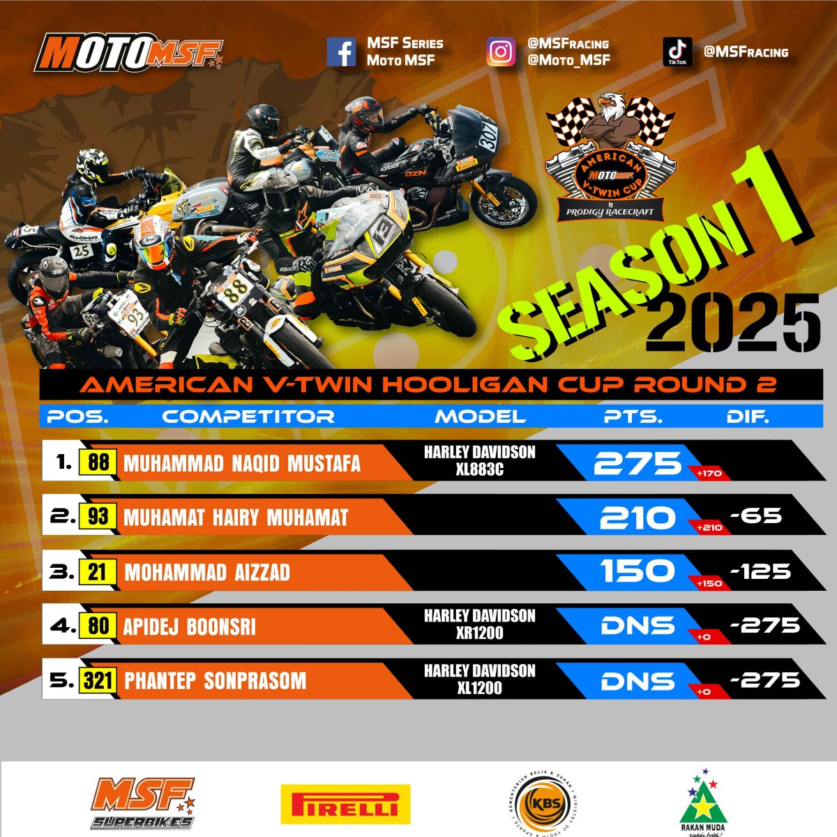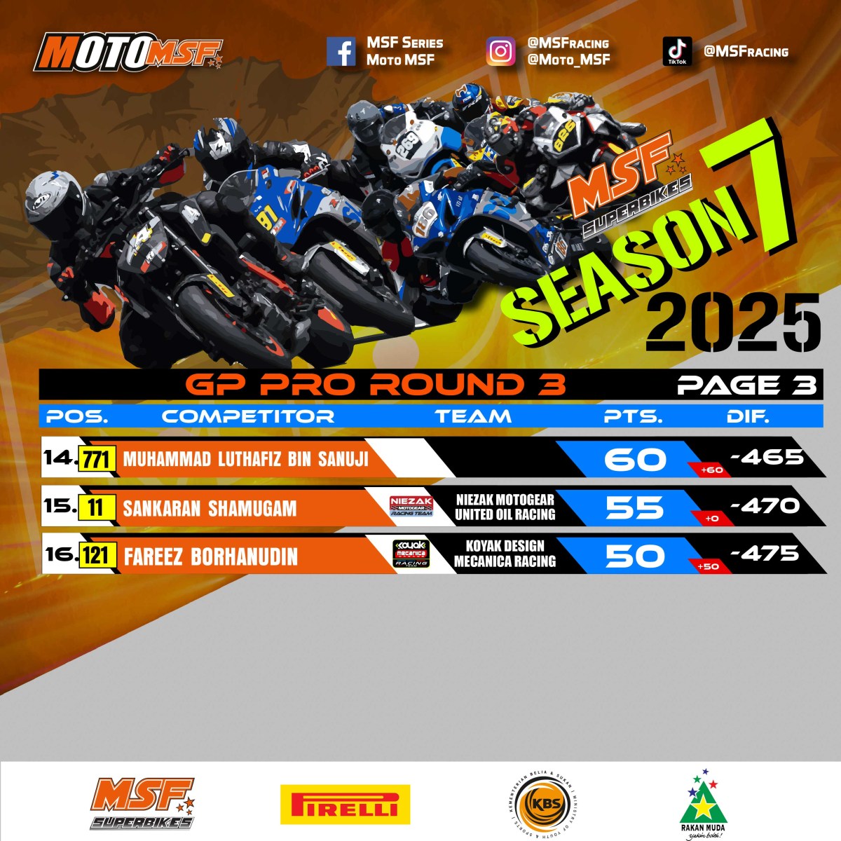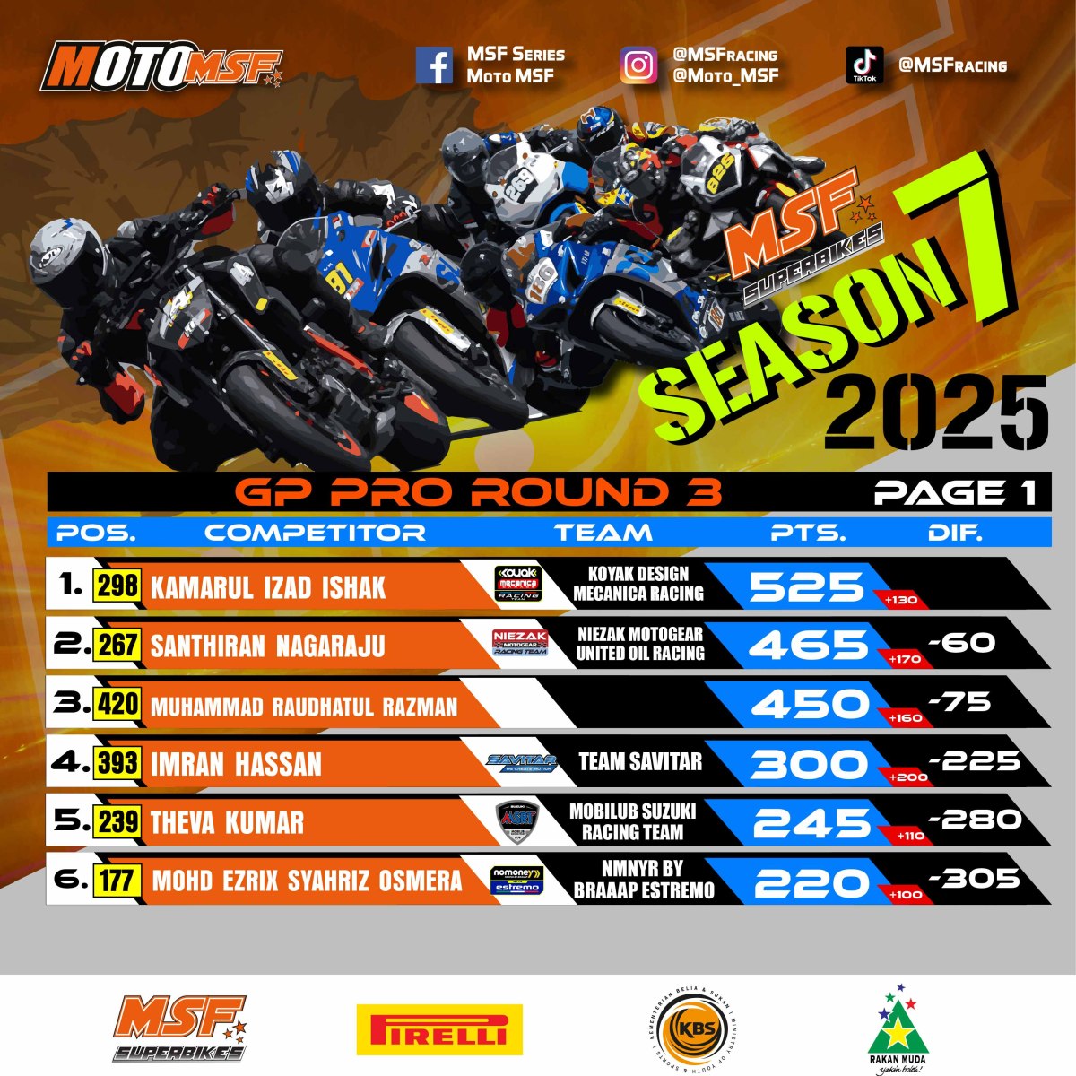 Kamarul Izad Ishak (Koyak Design Mecánica Racing) remains the man to beat with 525 points, extending his advantage with another strong performance. Santhiran Nagaraju isn’t far behind on 465 points, while Muhammad Raudhatul Razman sits in striking distance with 450 points – this trio is delivering fireworks every round.