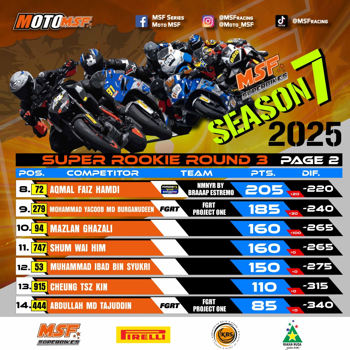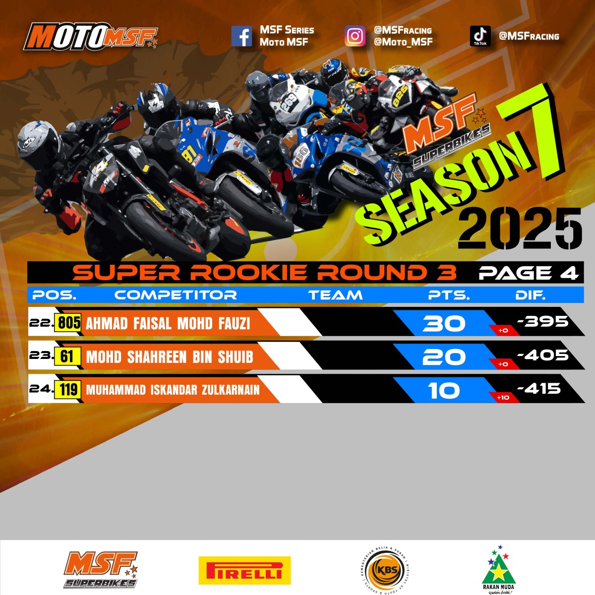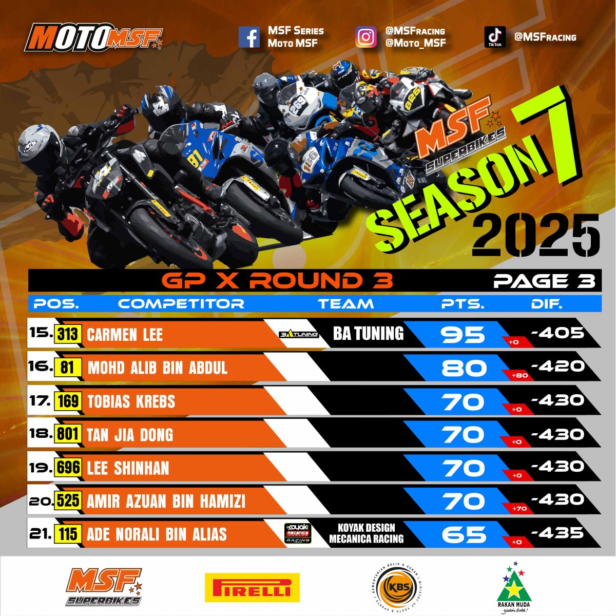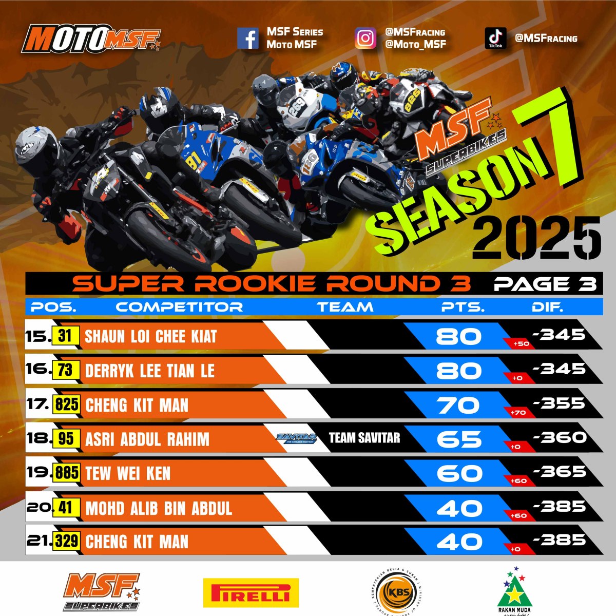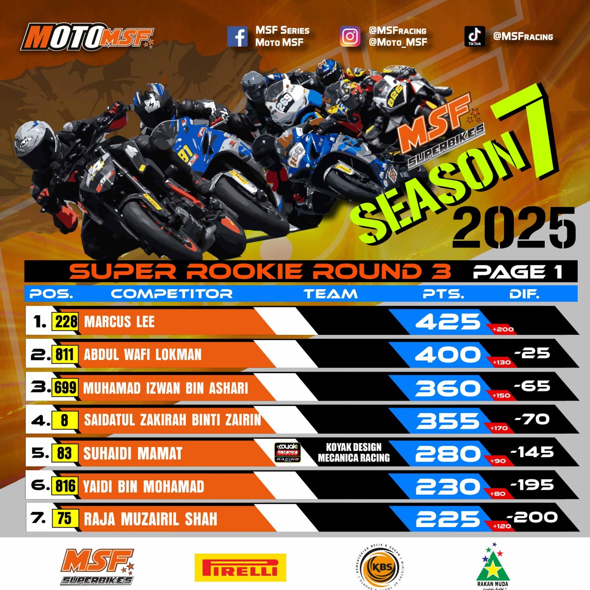The future stars of MSF Superbikes are shining bright in Super Rookie. Marcus Lee has surged to the front with 425 points, with Abdul Wafi Lokman (400 points) and Muhamad Izwan Bin Ashari (360 points) trailing closely. Every lap in this class feels like a glimpse into the next generation of Malaysian superbike talent.